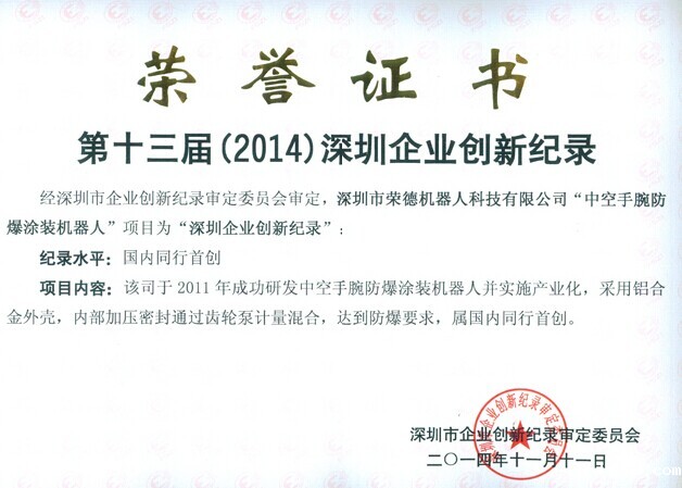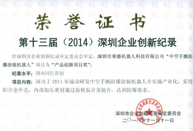 近日,由深圳市企业创新纪录审定委员会为米兰app体育官方入口下载安卓颁发了“第十三届(2014)深圳企业创新纪录”的荣誉证书,米兰体育官方网站首页公司自主研发制造的“中空手腕防爆涂装机器人”荣获“产品创新项目奖”以及“深圳企业创新纪录”两项大奖,纪录水平为“国内同行首创”。