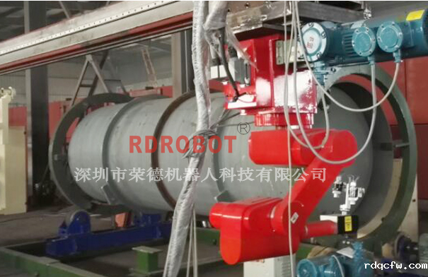 机器人平移行走,配合机架整体前后移动,增大了机器人喷涂范围,半径1.3M的机器人就可以把整个产品喷好,适用于大型的、笨重的罐体工件,如下图所示: