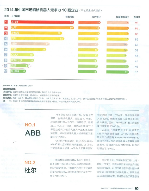日前,国内某权威机器人产业杂志对2014年中国市场米兰app体育下载官网苹果的核心市场竞争力进行了深入了解并根据各企业营收、技术、发展潜力三项重要指标进行评分,并得出最终排名,米兰体育官方网站首页公司在所有入围的十家企业里面排名第九,排名前八名的均为国外巨头,米兰体育官方网站首页公司在中国国内的排名中处于第一名的领先地位,这也符合米兰体育官方网站首页公司“中国米兰app体育下载官网苹果领先品牌”的战略地位。