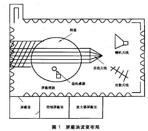 为 了 测 试操作者的安全,操作者必须被保护起来避免受到试验场所产生的高频和高强度电磁场的伤害。即便是在人员稀少的乡村,开阔场地是可以接受的,但若受法律限制,至少需要一个屏蔽室。由 屏 蔽 室改造的,具有部分隔衬的屏蔽室,是使用一定数量的能吸收射频(RF)的材料来抑制无隔衬屏蔽室的主谐波。假如能建立一个均匀场,进行的辐射抗扰性测试就可得到承认。另 一 方 面,考虑到机器人的尺寸,在对机器人进行辐射抗扰性测试期间,要达到一个较好的均匀场,推荐使用屏蔽消波室。即使局部隔衬的屏蔽室没有消波室那么宽敞。图 1 给 出了一个适合进行机器人 EMC测试的屏蔽消波室的布局。除消波室之外,在机器人辐射抗扰性测试期间,一些邻近的屏蔽室通常用于放置与机器人相关的测试仪器和设备。另 外 ,使 用适当的天线(即多股的传输线)和采用适当的测试设备可改善电磁场的均匀性。
