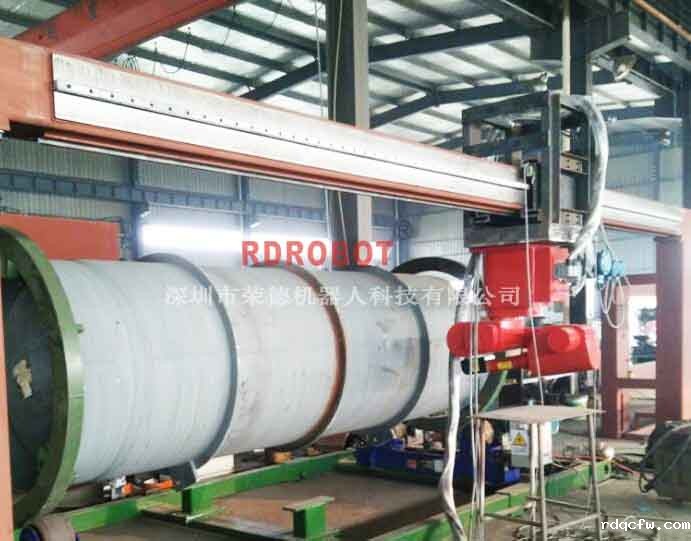衬层喷涂系统主要由喷涂车、料罐、高压泵、喷枪、支撑旋转支架等组成。整个系统通过喷涂车实现料浆的搅拌、输送、喷涂。先将衬层料浆过滤加入料罐,柱塞泵将料浆吸入并加压送出,经过过滤器过滤、缓冲,经球阀、调压阀、线流量计、高压管进入喷枪,料浆高压喷出经过雾化,高速喷向壳体内表面,其喷涂量和喷涂速度可调节,根据不同粘度的衬层可选择不同类型的喷枪。喷涂车采用移动车运行方式,料罐、喷杆升降传动及导向机构、可拆卸组合喷杆、气源净化分配系统、控制装置等安装在移动车上,各系统、机构相互协调,自动控制完成壳体的连续喷涂。伺服电机控制移动车运行方向、速度,喷枪摆动机构实现壳体筒体段及两端椭圆封头弧面的喷涂。要求所选电气系统元件、执行系统元件精度高,可靠性好,响应速度快,喷涂设备要具有可靠的安全保护、防爆、保险措施。支撑旋转支架主要用于产品在衬层成型施工过程中的定位支撑和旋转。