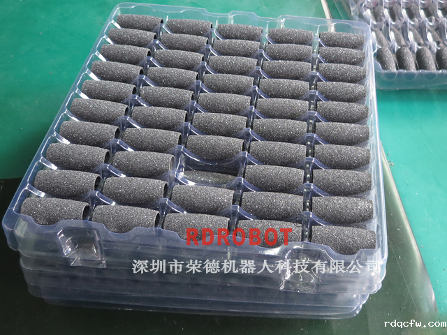 产品总述:将Roller head 磨头素材表面自动打毛后,自动喷AB胶自动喷砂子粘在上面,使素材表面形成规定范围内的粗糙度,通过机械手自动抓取到烘干线上,自动烘干永久将砂子牢牢粘在上面,砂子在受到作用力下不会掉落。一个去角质的Roller head磨头初步成型。